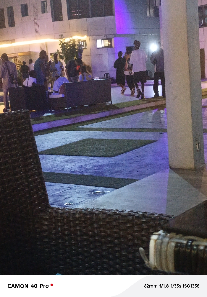 A photograph captures an outdoor gathering at night. People are standing and seated near modern patio furniture. A mix of light sources illuminates the scene, including overhead lighting and colored lights highlighting architectural features. The foreground is dominated by a wicker chair, which creates a sense of depth. The ground is a combination of stone and grass, and the background building appears modern. The overall mood is social and relaxed.