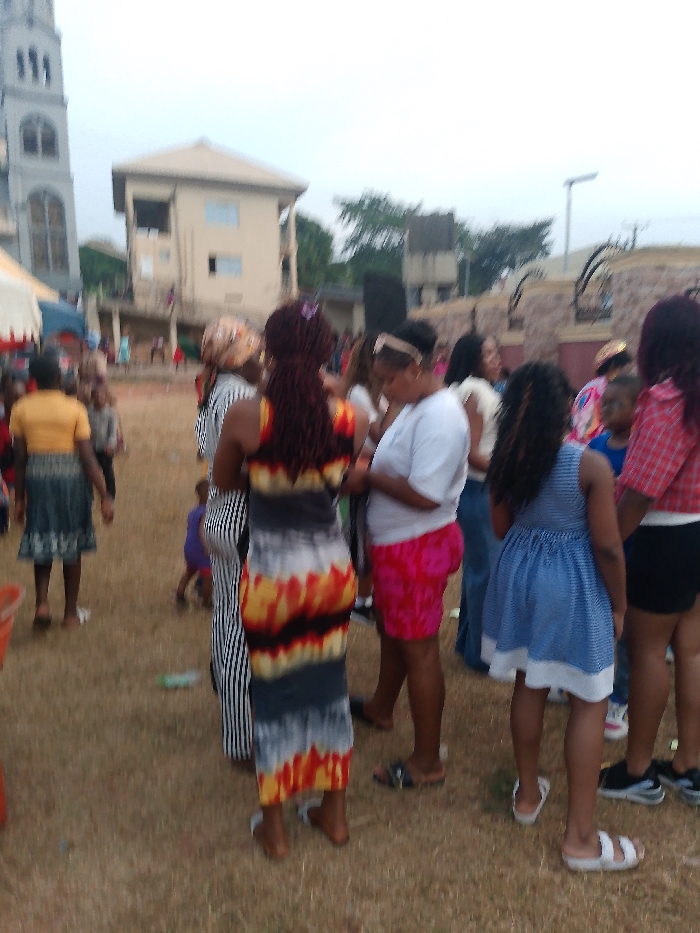 A crowd of people stands on a grassy field near buildings, including a tall church steeple. The focus is on several women and a young girl in the foreground. One woman wears a tie-dye dress, another a striped outfit. A child wears a blue and white dress. Other individuals are dressed in various casual clothing like t-shirts, shorts, and dresses. Some wear sandals, others wear sneakers. A few additional people can be seen in the background.