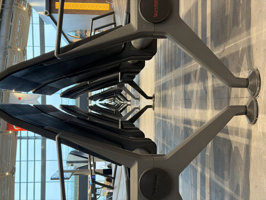 The image captures a low-angle perspective of an empty airport terminal waiting area located in Pendik, Turkey, consistent with Sabiha Gökçen International Airport