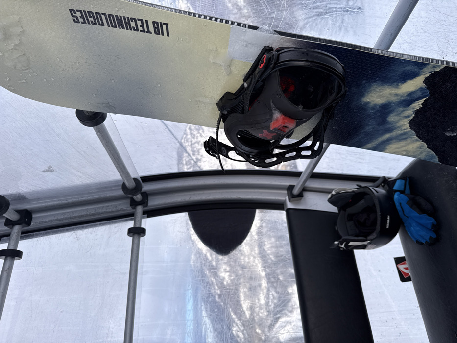 This image depicts the interior of a gondola cabin located in the ski resort area of Limone Piemonte, Italy. A "LIB TECHNOLOGIES" branded snowboard stands upright against the cabin's window on the right side of the frame. The snowboard's surface appears wet, with a light yellow-white upper section and a dark blue-black mountain graphic covering the lower portion. It is fitted with black bindings that include red accents. On a black cushioned seat to the left, a black "MDMXJ" ski helmet and a pair of blue ski gloves are placed. The cabin features grey metal support bars and large windows, which show condensation or external moisture. Through the windows, a snow-covered mountainous landscape with sparse trees and an overcast sky is visible in the background. No people are visible.