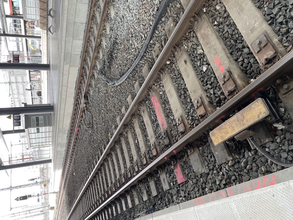 The image depicts a section of a railway station, city and country unknown, observed from a low angle, looking across multiple sets of tracks towards a raised platform and the station infrastructure beyond. In the immediate foreground and midground, four parallel sets of railway tracks are visible, laid on dark grey ballast. The tracks are secured to light-grey concrete sleepers by metal fastening clips. Numerous red spray paint markings are present on the concrete sleepers and the edge of the adjacent platform. A black corrugated conduit containing cables runs along the ballast between the two closest track sets. A trackside device, featuring a rectangular, rusted-yellow metal cover plate and connected by a black corrugated conduit, is mounted on the inner rail of the track closest to the platform. To the left, a light-grey concrete platform edge, textured with an anti-slip pattern, borders the tracks. Elevated above the tracks, a wider concrete platform is visible, featuring a small, glass-sided waiting shelter with a grey frame. Above the shelter, a digital sign displays "9 E" and further along, another sign displays "8 E". A slatted wooden bench with a metal frame is situated on this platform. The platform is covered by a large, grey overhead canopy structure supported by multiple grey pillars. In the background, additional railway tracks, overhead line structures, and several railway signals are present, with one signal displaying a red light. Distant, multi-story modern buildings are discernible beyond the station infrastructure. A single, distant, unidentifiable human figure is visible on a far platform. No trains are present within the immediate scene. The lighting suggests daytime conditions with clear weather.