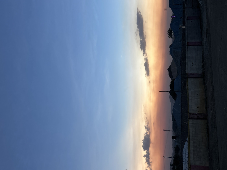 A twilight scene showcases a gradient sky, transitioning from deep blue to orange. A line of dark, elongated clouds breaks the horizon. An urban scene features low buildings and structures along a street. Tents or temporary structures can be seen. A tall, thin pole stands prominently in the distance, suggesting a telecommunications tower.