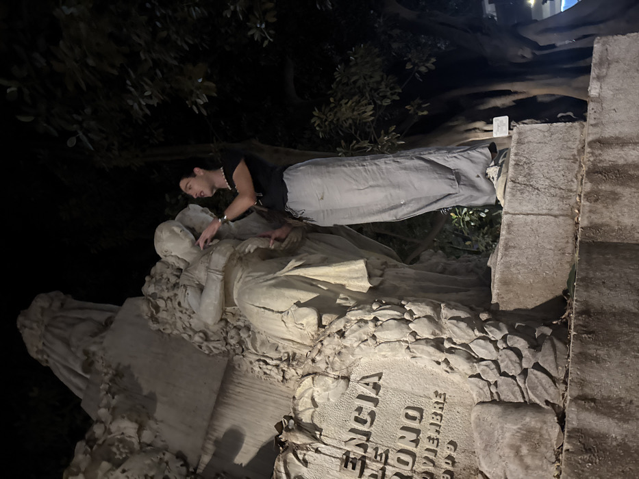 At night, an outdoor scene depicts a young male standing on the base of the Monumento a la Paz in the Jardines de la Glorieta, Valencia, Spain. The man, with light skin and short dark hair, wears a dark short-sleeved t-shirt, loose-fitting light grey trousers, and light-colored shoes. He is positioned to the right of a large stone allegorical female sculpture, part of the monument's lower tier. His right hand is raised and extended towards the sculpture's chest/shoulder area, while his left hand is also slightly raised. His mouth is open, suggesting he is speaking or singing. The monument, constructed of light-colored stone, features intricate carvings including a garland of leaves and an inscription on its front-left base reading "VALENCIA DE" followed by what appears to be "RONO" (or similar partially obscured text) and "NOVIEMBRE 1909". Above the female figure he is interacting with, another, less distinct figure is visible. The monument shows signs of age and some dark discoloration. The background is dark, dominated by the dense foliage of large trees, including a thick-trunked Ficus, illuminated by artificial light sources that cast strong shadows and highlight the man and parts of the monument. No other individuals or significant objects are visible.