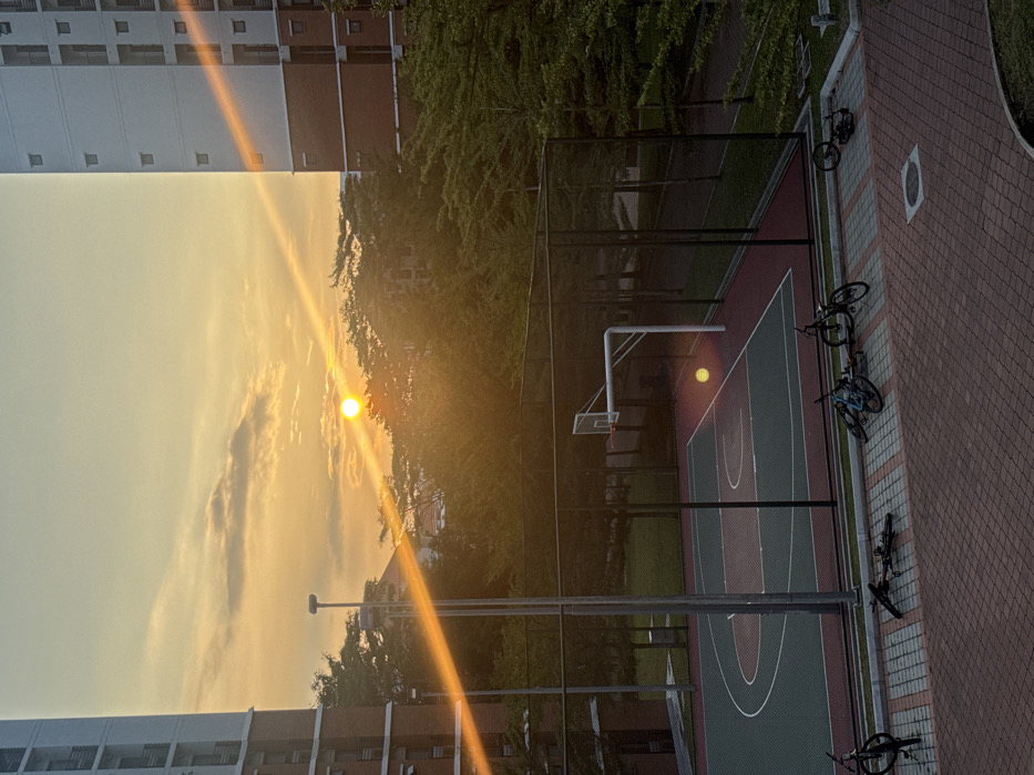 A high-angle view captures a basketball court at sunset. The sun, a bright orb, casts a golden glare across the scene, partially obscured by trees and buildings. The court is surrounded by a tall fence. Several bicycles lean against the brick wall near the court. A basketball hovers near the net. Buildings and trees are visible beyond the court. The sky is a blend of pale blue and golden hues.