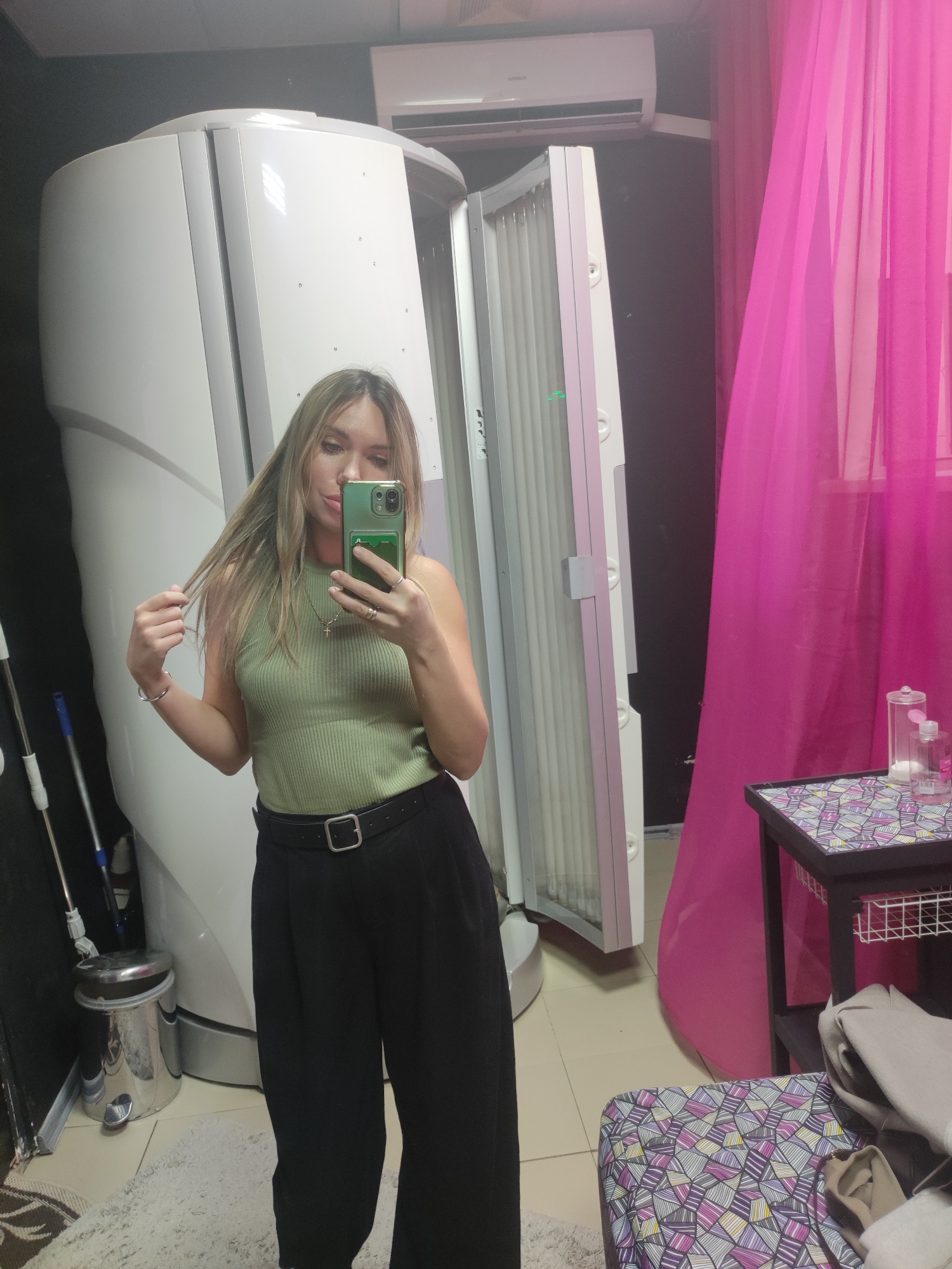 A young woman is taking a selfie in what appears to be a tanning salon. She is standing in front of a vertical tanning booth. The location could be in Votkinsk, Russia, but this is not verifiable from the image alone. The woman has long, light brown hair and is wearing a green tank top and black pants with a belt. She is holding her phone up to take the picture, and her expression is somewhat neutral. Behind her is the tanning booth, which is white and silver. To her right, there is a small table with some bottles on it and a pink curtain. The walls of the room are dark, and there is an air conditioning unit visible near the ceiling. A mop and bucket are visible on the left of the frame. The floor is tiled, with a patterned rug visible on the left of the frame.