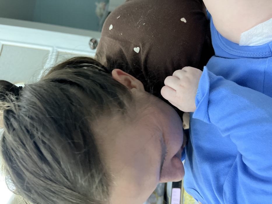 The scene depicts an indoor setting in the city of Razdol'e, Russia, showing a close interaction between an adult and an infant. A person with dark brown hair, pulled back into a bun, is positioned leaning forward and downward, with their forehead and right cheek visible. This individual wears a dark brown top adorned with numerous small, light-colored, heart-shaped patterns or debris. Their head is oriented towards an infant, whose upper body, left arm, and lower torso are partially visible. The infant is clad in a light blue long-sleeved garment and a white disposable diaper. The infant's small, closed left fist is visible, raised near the adult's face. In the background, a white interior door frame with a metallic doorknob is discernible, alongside a light blue wall and indistinct objects.