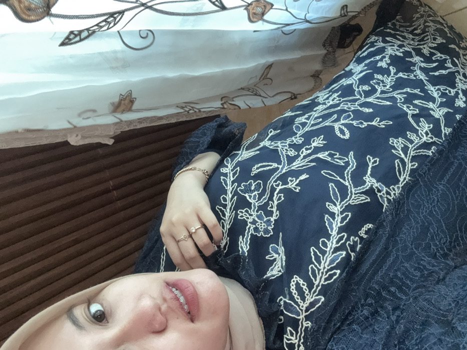 A person with light skin and a hijab lies angled on a brown surface. The individual has braces and wears a gold bracelet and rings. A dark blue garment with white floral embroidery covers much of the image. A sheer, patterned curtain is partially visible in the background, obscuring a portion of the brown surface.