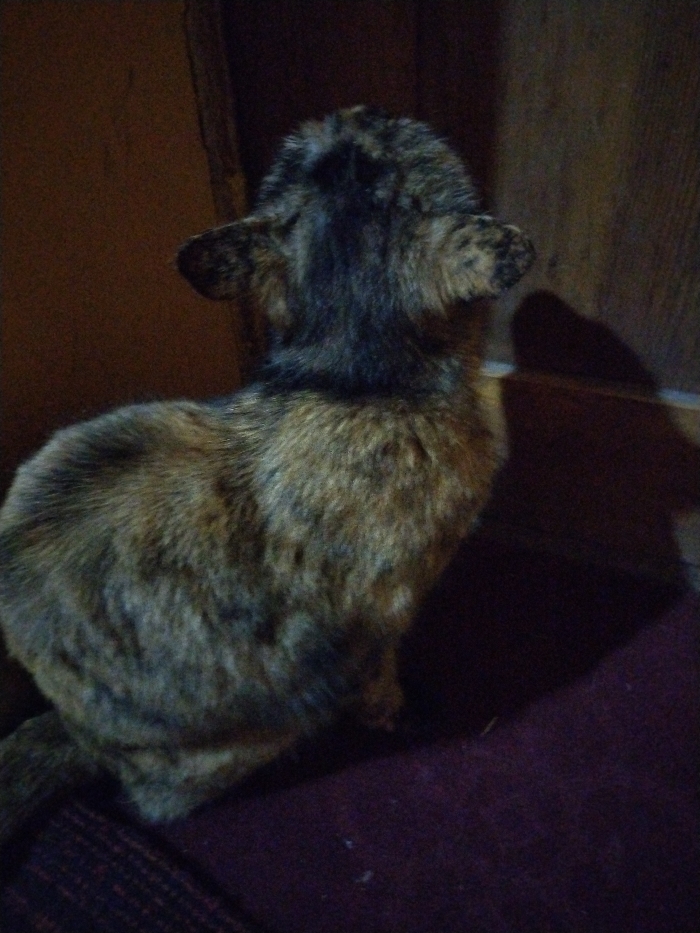 A cat, viewed from behind, sits on a dark purple surface. The cat's fur is a mix of brown, black, and gold, creating a mottled effect. Its ears are perked up. The background consists of a dark wall and what appears to be a doorway, creating a dimly lit setting with noticeable shadows behind the cat.