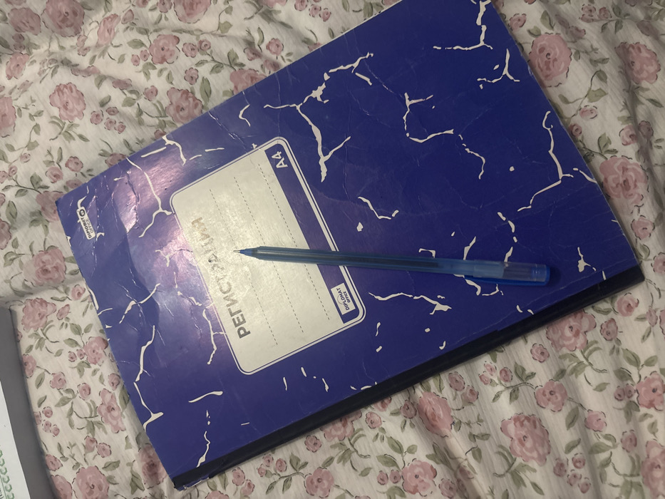 A blue A4 notebook rests on a floral patterned surface. The notebook, featuring a marbled design, is placed at an angle. On its cover is a white label with the word "РЕГИСТРАЦИЯ" written vertically, followed by several horizontal lines. A blue pen lies across the label, with its cap secured on the end. Part of another notebook is visible at the bottom left corner.