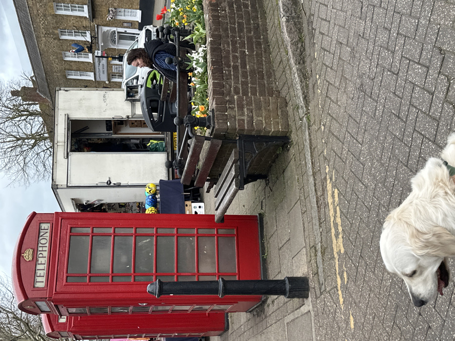 The image depicts an urban public space in Epping, within the Epping Forest District, United Kingdom, specifically near the "Clayton Court Flats" building visible in the background. The scene is overcast daylight, suggesting spring due to blooming daffodils and tulips in a brick planter. In the foreground, the head and upper back of a light-colored Golden Retriever dog are visible on the lower left, facing left with its mouth slightly open. It wears a green collar. The ground is paved with grey interlocking bricks, featuring faint yellow double lines. The mid-ground features two traditional red K6 telephone boxes on the left, one prominently displayed. A black bollard stands nearby. Adjacent to the bollard and extending across the scene is a low brick planter containing yellow and white daffodils and tulips. Wooden benches with black metal frames are attached to the planter. On one of these benches to the right, a female adult with dark, curly hair is seated, facing right and slightly away from the camera. She wears a dark vest over a patterned garment. Behind the planter and seated woman, a white panel van, functioning as a market stall, is parked with its rear doors open. Merchandise, including several yellow and blue footballs, is displayed on a table covered with a dark blue cloth in front of the van. A green bag is visible inside the van. The vehicle's license plate reads "CU61 LJL". In the background, a light-colored brick building with multiple white-framed windows is visible, identified by a sign as "CLAYTON COURT FLATS". A decorative sign featuring a blue cockerel on a weather vane extends from this building. A white SUV is partially visible parked near the building. Bare tree branches are discernible against the overcast sky above the structures.