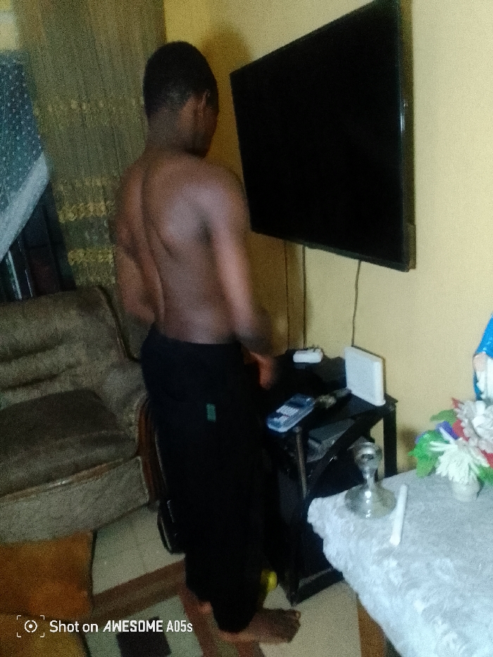 This image captures an indoor domestic scene, specifically a living room, located in Onitsha, Nigeria. A male individual stands in the foreground, viewed from behind. He is shirtless, displaying visible back musculature, and wears black trousers. He is barefoot. His gaze is directed towards a large, wall-mounted, black flat-screen television, which appears to be powered off. Black cables descend from behind the television towards a multi-tiered black shelf unit positioned directly beneath it. On the top shelf of this unit, a white game controller and a white rectangular electronic device, possibly a modem or router, are visible. A blue and white feature phone rests on a lower shelf. To the right of the shelf unit, a table draped with a white, patterned lace-like tablecloth holds several items: a blue and white religious statue, a silver-colored candle holder containing a white candle, and a vase with artificial flowers in white, red, and green. In the left background, a brown and beige upholstered armchair is partially visible, situated in front of green patterned curtains. The walls of the room are painted a light yellow color, and a reddish-brown mat is partially visible on the floor in the lower-left corner.