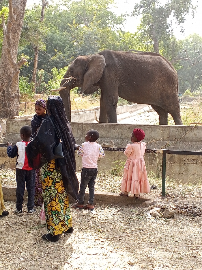 - "The scene, set in Garun Gawa, Nigeria, features a large African elephant and five human observers in an outdoor enclosure" by FM-q4R863, licensed under CC BY 4.0