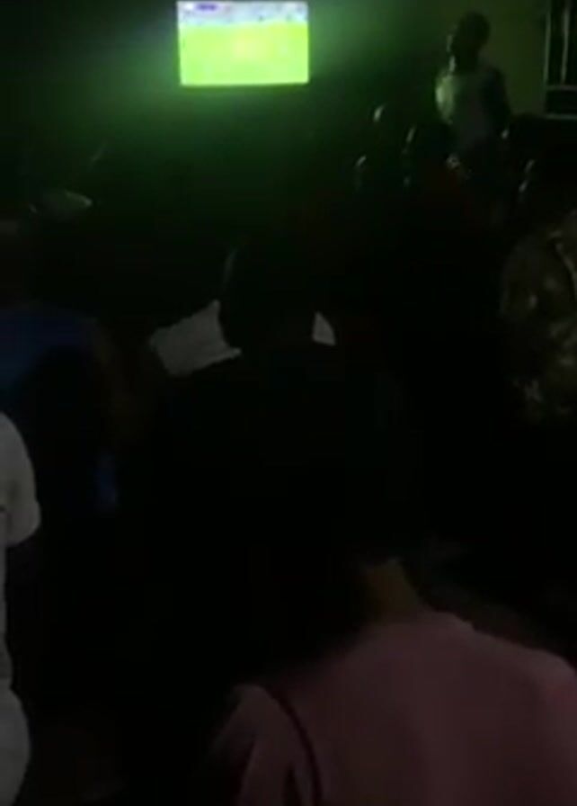 A crowd of people are gathered in a dimly lit area, seemingly watching a television screen. The screen displays a broadcast, possibly a sporting event, as suggested by the cheering. The light from the TV screen illuminates the immediate surroundings, casting shadows on the individuals in the audience. Some are standing, while others are seated, all focused on the screen. The atmosphere appears lively, filled with shared anticipation and excitement. The limited visibility suggests a night setting or an indoor location with minimal lighting.