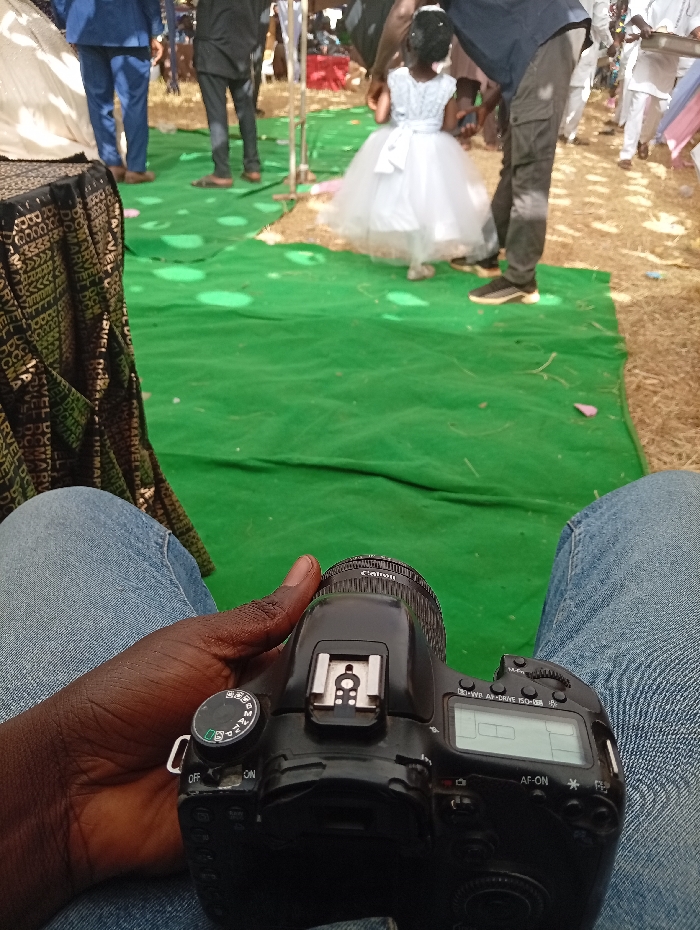 The image depicts an outdoor event in Kerang, Nigeria, from a first-person perspective. In the immediate foreground, a person's legs, dressed in blue denim jeans, are visible. A black Canon DSLR camera with a lens is held by the right hand, angled slightly right, with its top LCD screen and mode dial (set to a green automatic program) clearly visible. A vibrant green carpet is laid directly onto light brown, dry earth, extending into the midground. Scattered pink petals are present on this carpet. A young child, presumed female, wearing a white formal gown with a full skirt and a large white bow on the back, stands on the carpet facing away from the viewer. An adult male, dressed in dark trousers and a dark shirt, stands near the child, appearing to interact or assist. Further back on the green carpet, the lower half of several other individuals are visible, including one person in blue trousers and brown shoes, and another in dark trousers and sandals. To the left of the green carpet, a table is draped with a black cloth featuring a repeating gold pattern. Partially visible behind this table is a white tent structure. The background includes additional people in various attire, some in white traditional garments, within what appears to be a communal outdoor gathering space with temporary shelters.