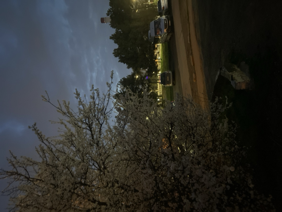 This image captures an outdoor scene at dusk or early night in Krasnodar, Russia. The foreground on the left is dominated by a large tree in full blossom, displaying numerous small white flowers on its dark branches. To the right, a paved surface, likely a parking lot or access road, holds three parked vehicles: a light-colored minivan/SUV, a darker minivan/SUV, and a partially visible white sedan on the far right. Beyond this area, a green space, possibly a park, is visible, featuring multiple deciduous trees under artificial illumination from streetlights. In the background, against a dark blue-gray, overcast sky, a tall industrial chimney with a red and white striped top band is prominent. A low, light-colored concrete barrier is situated in the lower right foreground. No individuals are present.