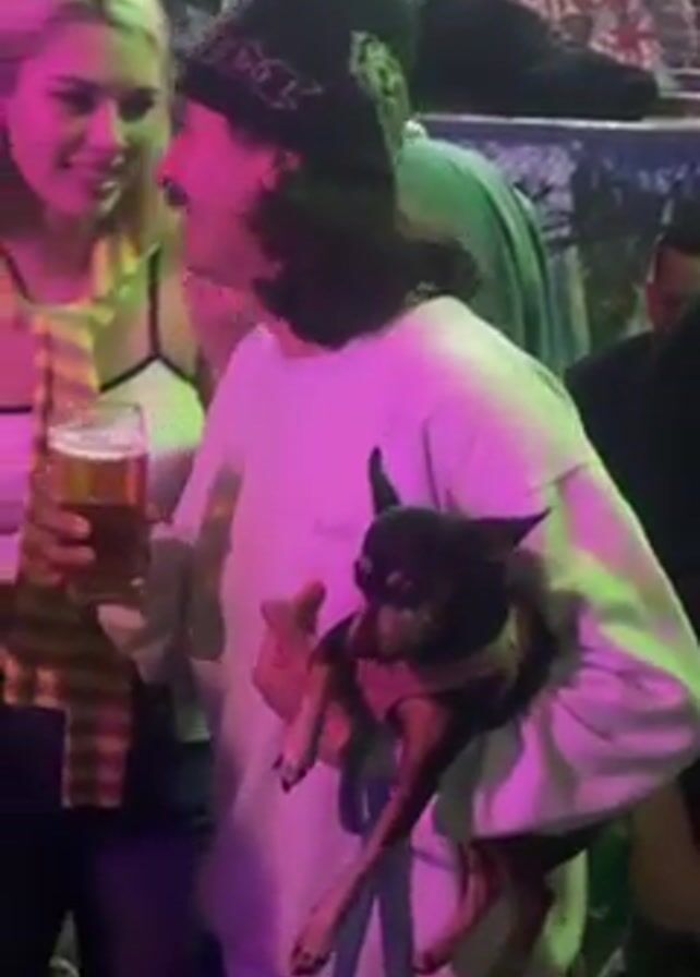 crowded, dimly lit indoor space, possibly a bar or party venue. A person with long dark hair, a mustache, and a black bandana is holding a small black dog in their arms while holding a glass of beer in the same hand. They are wearing a light-colored sweatshirt. They are talking to a blonde woman who is also holding a drink, possibly a beer in a bottle and a glass of beer. She is wearing a white top, jeans, and a yellow and brown striped scarf or tie. Other people are visible in the background, some with drinks. There is graffiti or stickers on the wall behind them. The lighting shifts between pink and green tones.
