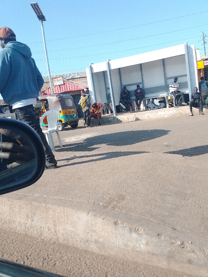 A street scene shows people waiting at a bus stop. A light-colored shelter with benches holds several seated individuals. More people stand nearby, including one beside a small auto-rickshaw. A street lamp post rises high above the scene. A figure in a blue hoodie walks on the road's edge, and the partial view of a car's side mirror intrudes from the left. The road surface is slightly textured, and buildings are visible in the background beneath a clear sky.