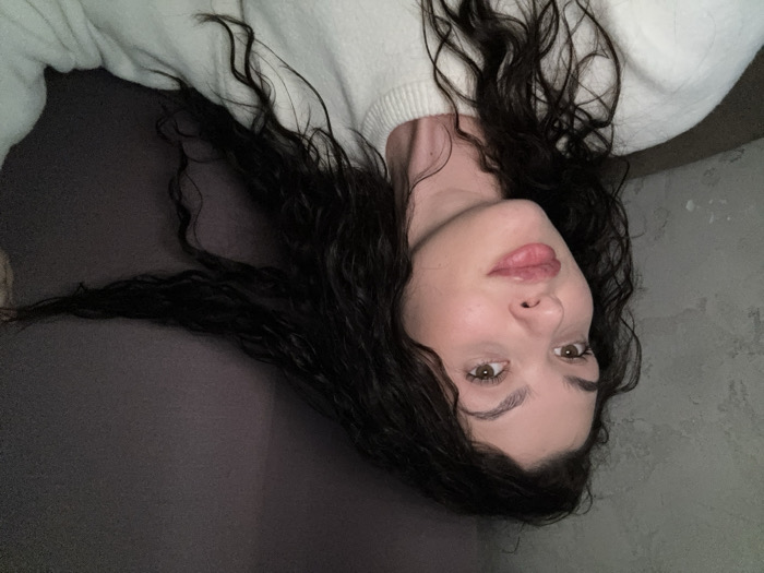 A woman with dark, curly, and wet hair lies on a grey surface. She wears a light-colored sweater. The woman's face is centered in the frame with light skin, brown eyes, and full lips. The background is a blurry mix of gray and light colors. The image is slightly rotated, placing the woman's head at the top right.