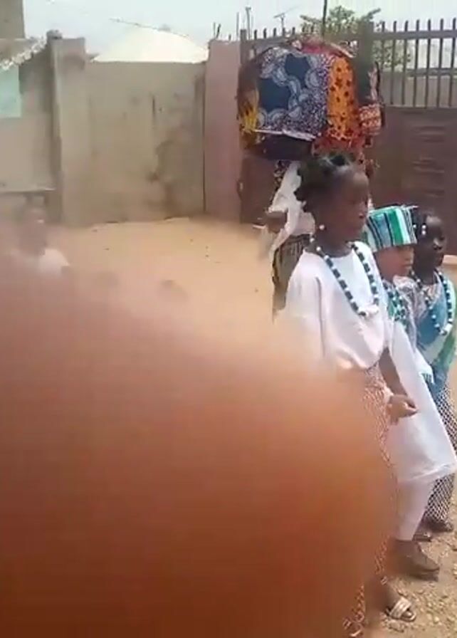 In an outdoor setting, a group of children is arranged in what appears to be a performance or cultural presentation