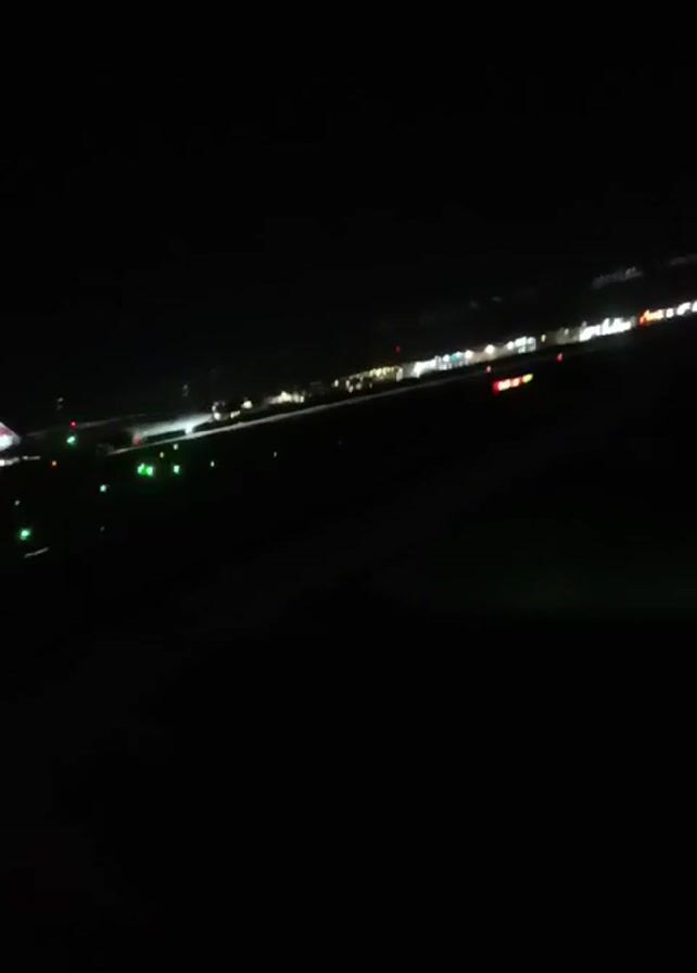 At night, the blurred view from an airplane window shows an airport runway with various lights. The runway is lined with green and red lights. There are also white lights visible in the distance, possibly from buildings or other structures at the airport. The foreground is dark, and the scene is somewhat shaky. The video appears to be taken during taxiing or shortly before takeoff/landing, as the lights of the runway are visible but not in sharp focus.