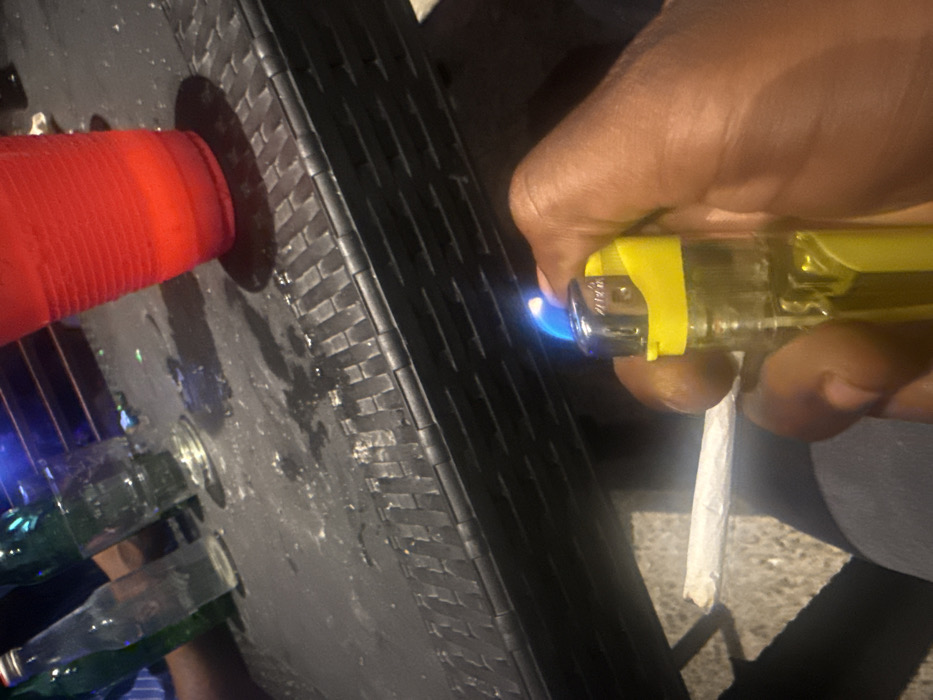 The image depicts a close-up, low-light scene occurring in Lokoja, Nigeria. In the foreground, a dark-skinned hand is shown holding a yellow translucent butane lighter, actively emitting a blue flame. Below the lighter, the hand simultaneously holds a hand-rolled cigarette, positioned for ignition. The midground consists of a dark-colored, woven-texture table surface, possibly plastic or rattan, exhibiting multiple liquid spills and condensation marks. Resting on the table are a red plastic cup containing a translucent liquid, an empty clear drinking glass, and three empty glass bottles (two green, one clear). The background is dimly lit with a distinct blue ambient light source, indicating an artificial lighting environment.