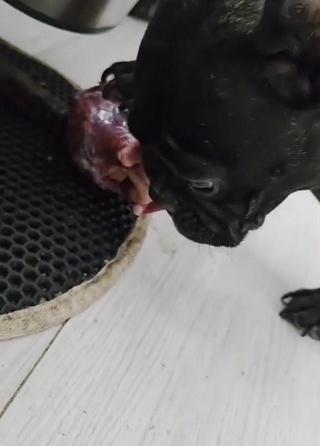 A black French Bulldog is standing on a light wood-look laminate floor and eating a large, raw meat organ, possibly a heart or kidney