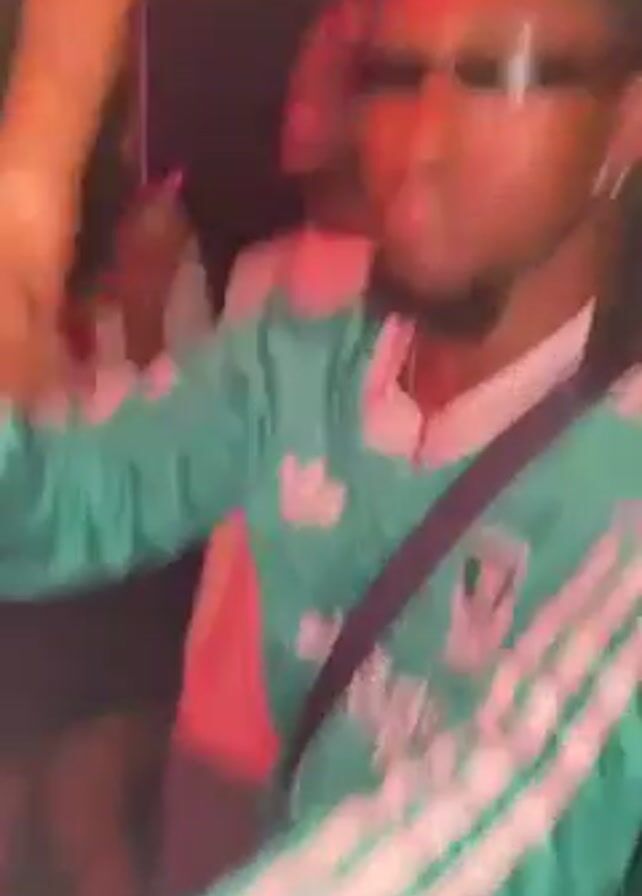 people dancing in a nightclub. A man with sunglasses and a green jersey is facing the camera. He is moving along with the crowd. The scene moves around the dancefloor, lit up in red lighting. Other people are visible, some with their hands up in the air. A red laser show is above the crowd. Speakers are visible on the sides of the room.