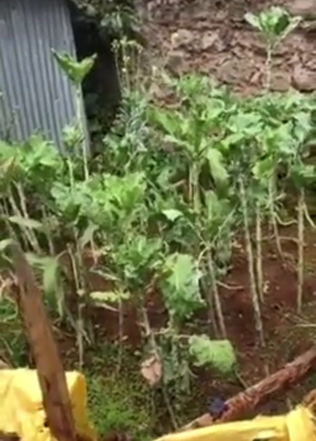 small garden with various green plants, possibly vegetables, growing close together in rows. The plants have thick stalks and large, leafy green tops. The soil appears to be dark red. In the background, there is a stone wall and a corrugated metal structure. Some debris and a yellow tarp are visible in the foreground. The video is taken at ground level with a slight upward tilt.