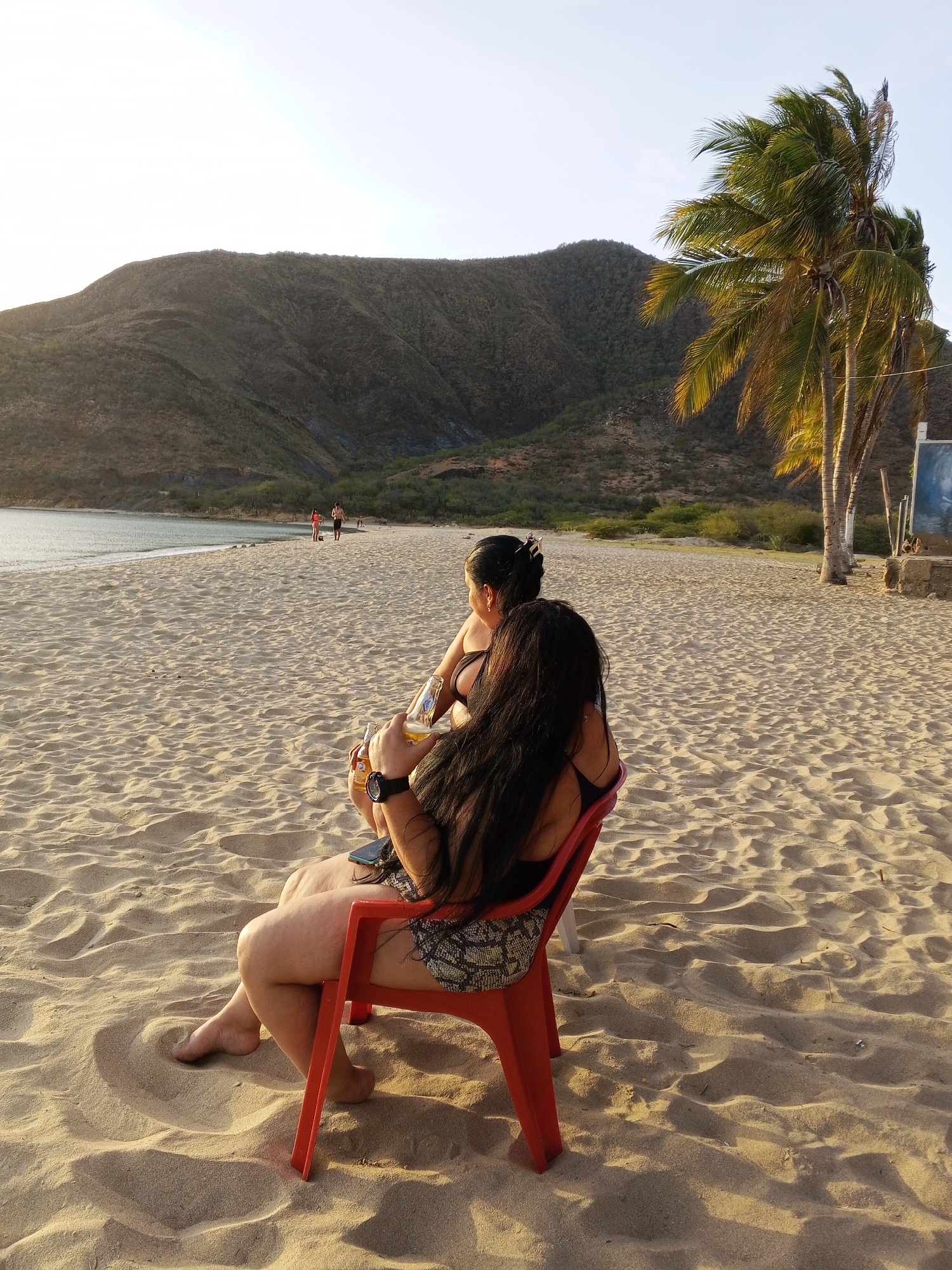 Two women are sitting on a red plastic chair on a sandy beach. The woman in front has long, dark hair and is wearing a dark-colored top and patterned skirt. The other woman is seated behind her, with her hair pulled back. The women are holding beer bottles. In the background, there is a large, barren mountain, palm trees, and a few people walking along the beach. The sky is clear and bright.