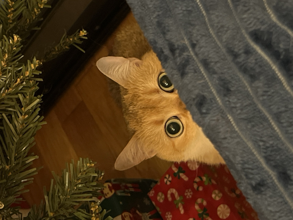 An orange tabby cat peers out from behind a blue blanket, its large green eyes wide and focused. The cat is positioned near a Christmas tree, with green branches visible to the left. A wrapped present with a red, candy cane-themed pattern sits below the cat. The cat's face is partially obscured by the blanket, giving it a playful, inquisitive appearance.
