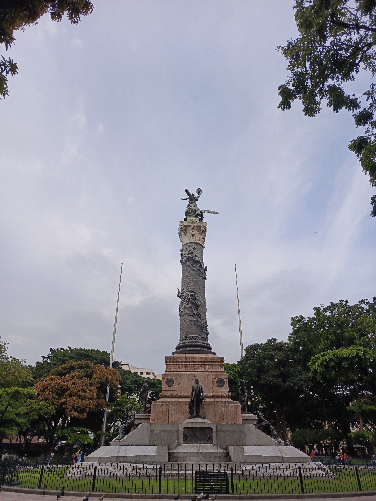 Independence Column (Columna de los Próceres de la Independencia) in Guayaquil, Ecuador, located in the Parque Centenario. The monument is a tall, ornate column with a statue of a woman holding a torch at the top, and various sculptures and reliefs decorating the shaft. It has a pink base with sculptures of men at different spots around its four sides. Two flagpoles stand on either side of the column. The park surrounding the monument is green with trees and grass. A black metal fence surrounds the base of the monument. Several people are visible in the background, walking or sitting on benches in the park. The sky is overcast with grey clouds.