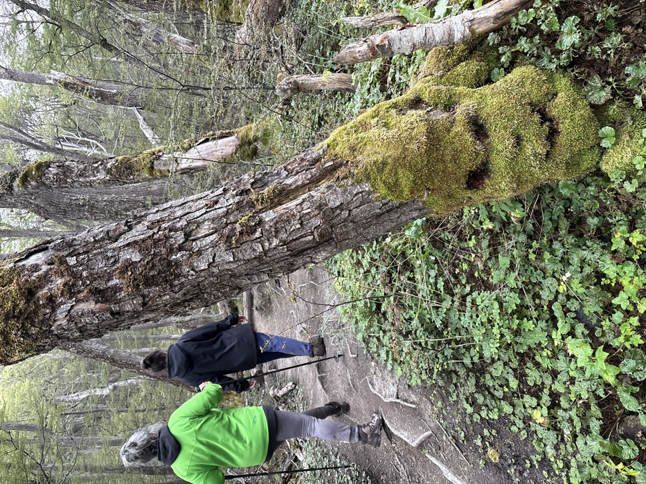 Two people hike on a path under a fallen, moss-covered tree in a forest. The hikers use trekking poles, one wearing a green jacket, the other in black. The tree's trunk lies horizontally across the path, covered in moss. Green vegetation surrounds the trail. The forest consists of thin, bare trees. The path appears uneven.