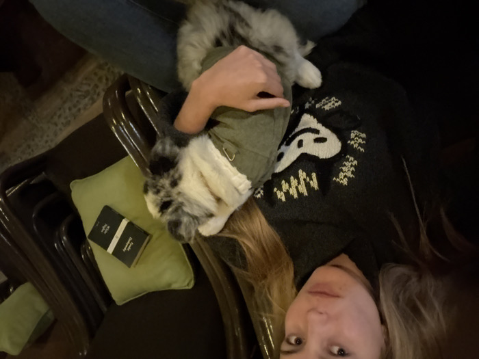 A person with blonde hair is visible from the chest up, wearing a dark sweater with a white design, holding a furry, spotted animal that appears to be a rabbit. The rabbit wears a green and white outfit. The person is seated, with what appears to be stacked chairs to the left and a green pillow with a book resting on it. Jeans are also partially visible above.