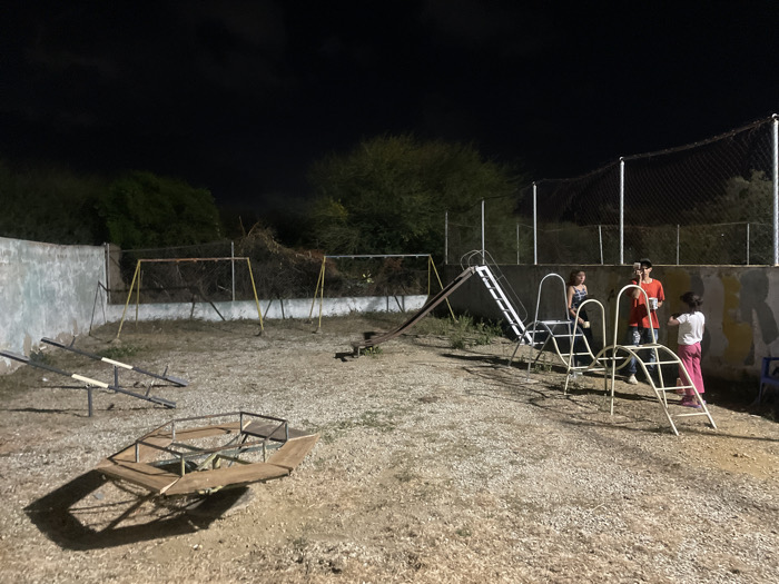 The scene depicts a neglected outdoor playground at night in Altagracia, Venezuela