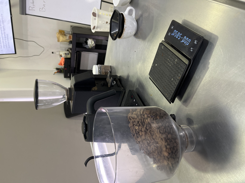 A top-down shot features coffee brewing equipment on a stainless steel counter. A burr grinder with a bean-filled hopper is prominent. To the right is a digital scale reading "0585.000," along with a speckled ceramic mug with a black filter lid. In the background, a whiteboard with writing and a black shelf with various objects are visible. The scene is well-lit, highlighting the textures of the equipment and surfaces.