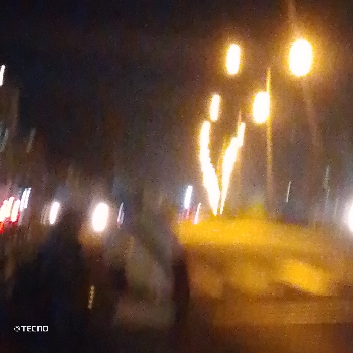 A blurred nighttime scene with bright lights dominating the view. Two prominent streetlights illuminate the area. Streaks of light suggest movement, possibly from vehicles. A group of people can be partially seen in the lower left, their forms indistinct due to the motion blur. The overall impression is of a busy street at night captured with a slow shutter speed. A 'Tecno' watermark is present in the bottom left corner.