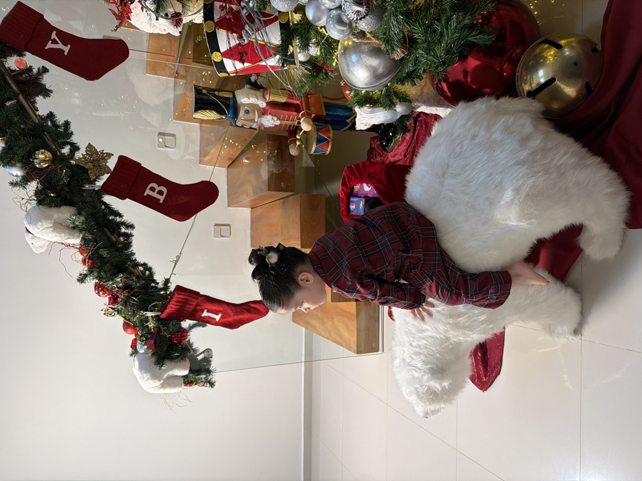 A young girl in a red plaid shirt leans towards a large Santa Claus decoration with a white beard and red suit. A Christmas tree decorated with ornaments, nutcrackers, and stockings with letters 'Y', 'B', and 'I' hangs from above. The background consists of white walls and wooden block steps.
