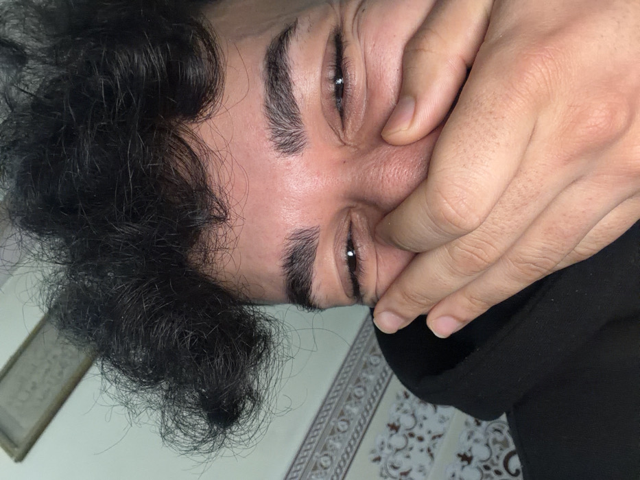 An upside-down close-up shows a person covering their mouth with their hand. They have dark, curly hair, dark eyebrows, and eyes. The background reveals part of a framed picture on a white wall and a patterned tiled floor. They are wearing a black garment. The focus is on their face, with a pensive or sad expression.