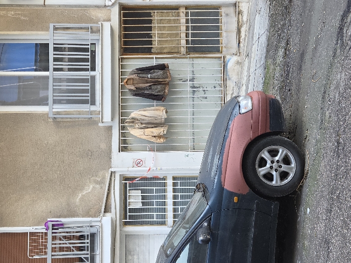 A dark blue car with a red front panel is parked next to a light beige building. Clothes hang on a barred window of the building. The window above has a metal grate, and the one below is barred. A window with horizontal bars is to the left, with a purple cloth atop it. The ground to the right of the car appears to be an asphalt road or path.