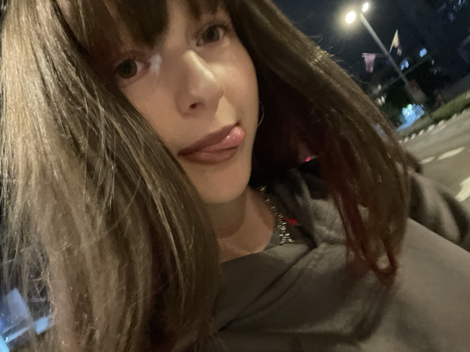 A close-up selfie shows a young woman sticking out her tongue. She has brown hair with bangs and is wearing a gray hoodie with a silver chain necklace. The background suggests an urban environment at night with streetlights and a road visible. Her expression is playful, with a hint of rebellion.