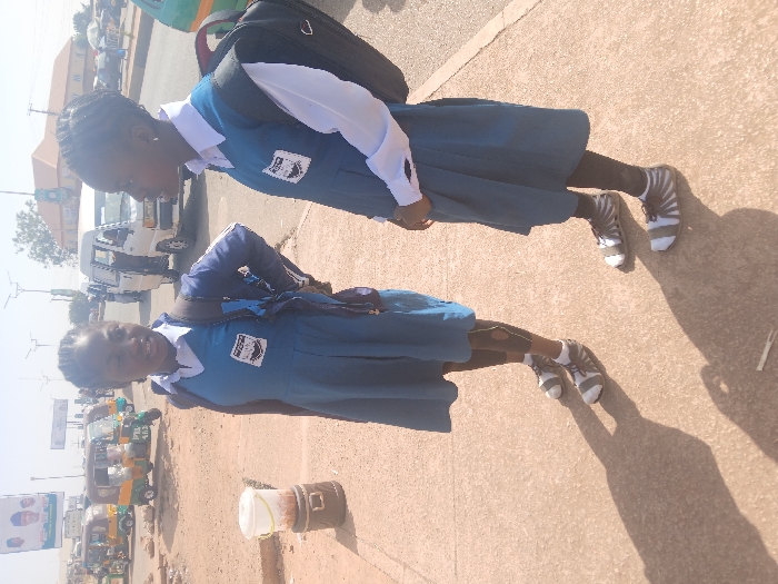 The scene in Heany, Zimbabwe, depicts two females in school uniforms standing on a paved sidewalk under direct sunlight
