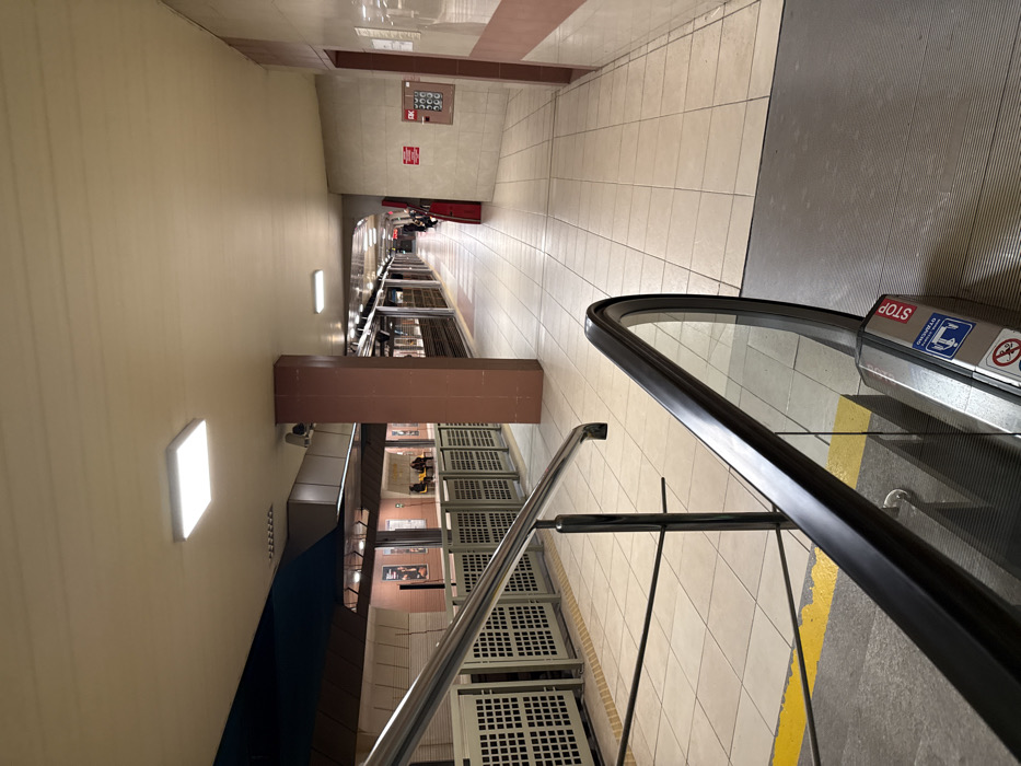 The image depicts an underground metro station, identified as part of the Sofia Metro system in Sofia, Bulgaria. The vantage point is from the top of an escalator descending into the station. In the foreground, the black handrail and clear glass balustrade of the escalator are prominent. A silver metallic panel at the escalator's base displays a red "STOP" button and a pictogram indicating restrictions on items such as luggage. To the left of the escalator, a polished chrome-finished handrail ascends alongside a tiled surface. The station concourse floor is composed of light beige square tiles, with a yellow safety line visible at the immediate edge of the escalator. A large, reddish-brown rectangular pillar stands centrally, dividing the main concourse from the metro platform. The platform is protected by a continuous light grey perforated metal safety barrier. Beyond this barrier, on the platform, two individuals are seated on a bench, and a third person stands nearby. The platform walls feature sections of darker reddish-brown paneling. Along the right side of the concourse, a light beige tiled wall runs into the distance, accented by a horizontal reddish-brown strip. Mounted on this wall are a red fire extinguisher cabinet and an adjacent red control panel with multiple buttons and numerical labels. Further down this concourse, three additional indistinct figures are visible. The station's ceiling is uniformly light beige and illuminated by numerous square, flush-mounted LED light fixtures. The environment appears clean and well-lit by artificial means.