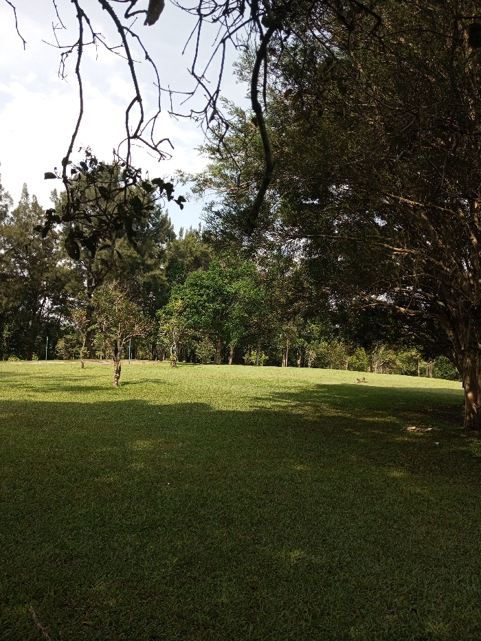 A sprawling green field dominates the scene, gently sloping towards a dense treeline. Various trees dot the landscape, some tall and imposing, others slender and sparse. Shadows cast by the trees stretch across the field, creating a mix of light and dark patches. Branches and twigs partially frame the upper portion of the view, adding depth and texture. The sky peeks through the canopy, hinting at a bright day.