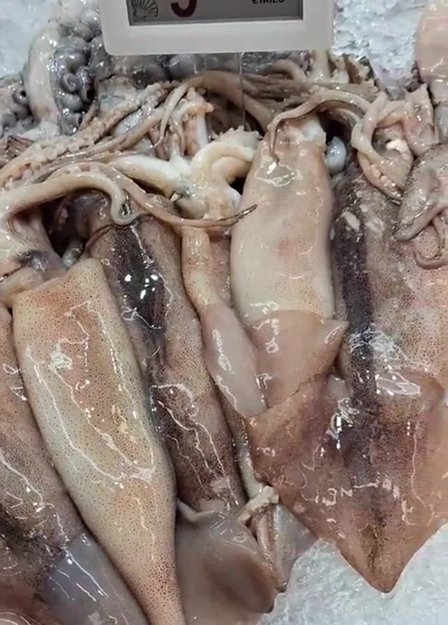 close-up of seafood at a market or grocery store. The seafood is arranged on a bed of ice, and includes squid, small cuttlefish, and octopus tentacles. There are price tags displayed above each type of seafood. The price for the squid is 5.75 euros per kilo, the cuttlefish is 8.45 euros per kilo, and the octopus tentacles are 7.95 euros per kilo. The video appears to be taken from a slightly elevated angle.