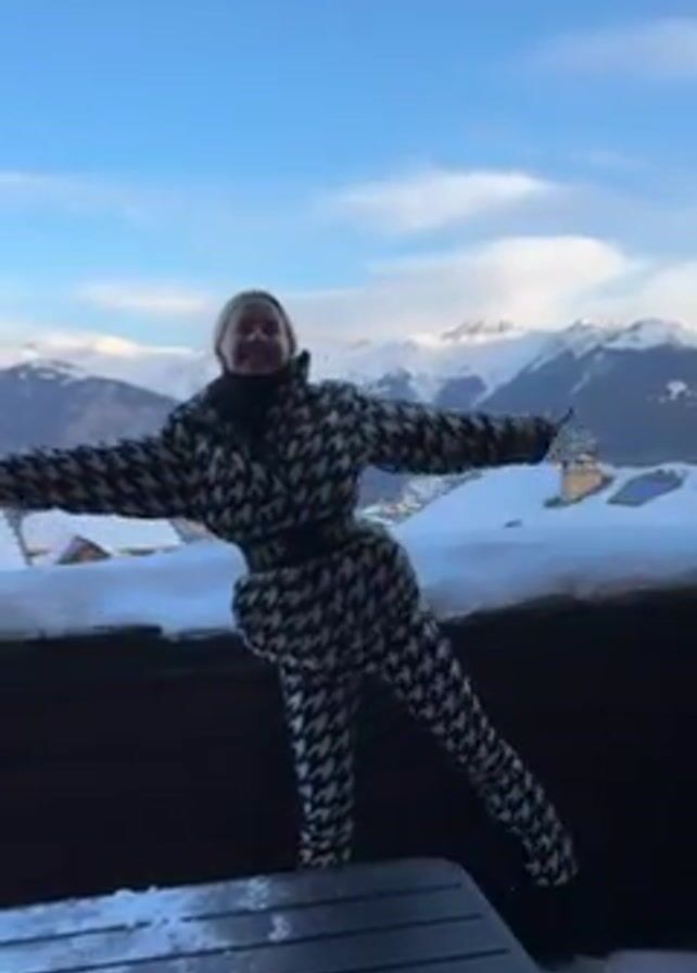 A woman stands outdoors in a ski jumpsuit with a black and white houndstooth pattern. She's wearing a black belt with the word "Perfect" on it. Her arms are extended to the sides, and her left leg is lifted, forming a pose. Behind her, a mountain range covered in snow stretches across the horizon under a blue sky. The woman is standing on a dark wooden deck, partially covered in snow.