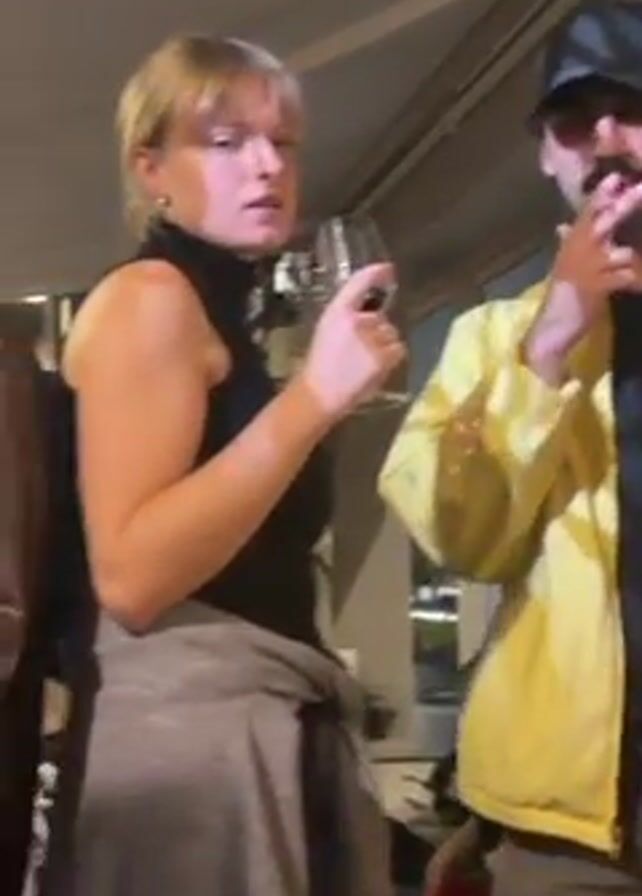 group of people, presumably at a social event, standing in an outdoor or semi-outdoor setting. There are several individuals visible, including a woman with blonde hair holding a glass of red wine and talking to a man in a yellow jacket and a baseball cap. The camera briefly pans across the scene, showing other people in the background, some of whom are wearing jackets and sweaters. The environment appears to be a restaurant or bar patio, with some outdoor furniture and structures visible. The lighting suggests it is either evening or a dimly lit space. The atmosphere seems relaxed and social.