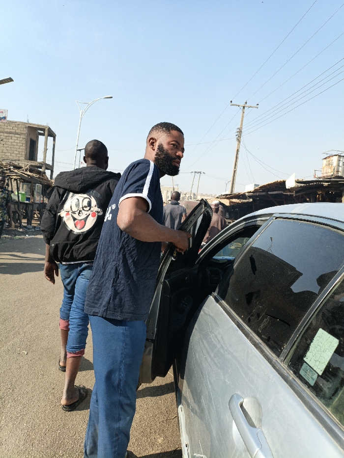 The image captures an outdoor daytime scene in Kofar Mazugal, Nigeria, under a clear sky. A light-colored sedan, likely silver, is parked on a paved road, with its front passenger door open. A male subject, mid-20s to 30s, with a dark, trimmed beard and short dark hair (fade cut), stands next to the open car door, facing right and looking slightly away from the camera. He wears a dark blue t-shirt with white stripes on the sleeves and blue jeans. His left hand is on the interior of the open car door. The car exhibits surface dirt and a sticker on the rear passenger window. Immediately behind him, another male subject, viewed from the back, walks away. He is dressed in a black hooded jacket with a large white cartoon face graphic on the back, light blue jeans rolled to reveal reddish fabric, and dark flip-flops. The road surface is a light-colored asphalt or concrete, appearing dusty. In the background, to the left, an unfinished or dilapidated concrete block structure is visible. Further back, numerous rudimentary market stalls or structures constructed from wood and corrugated metal line both sides of the street, indicating a commercial area. Utility poles with power lines and a modern streetlamp are present against the clear sky. Several other individuals are visible in the background, largely obscured by distance and other structures.
