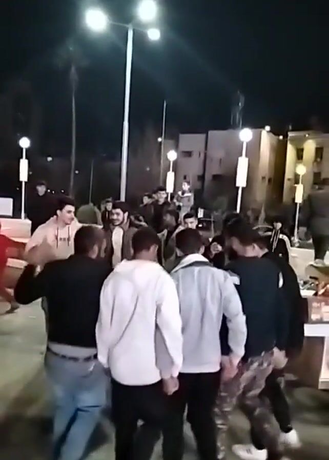 A group of approximately 20 people, mostly young men, are gathered in a public square at night