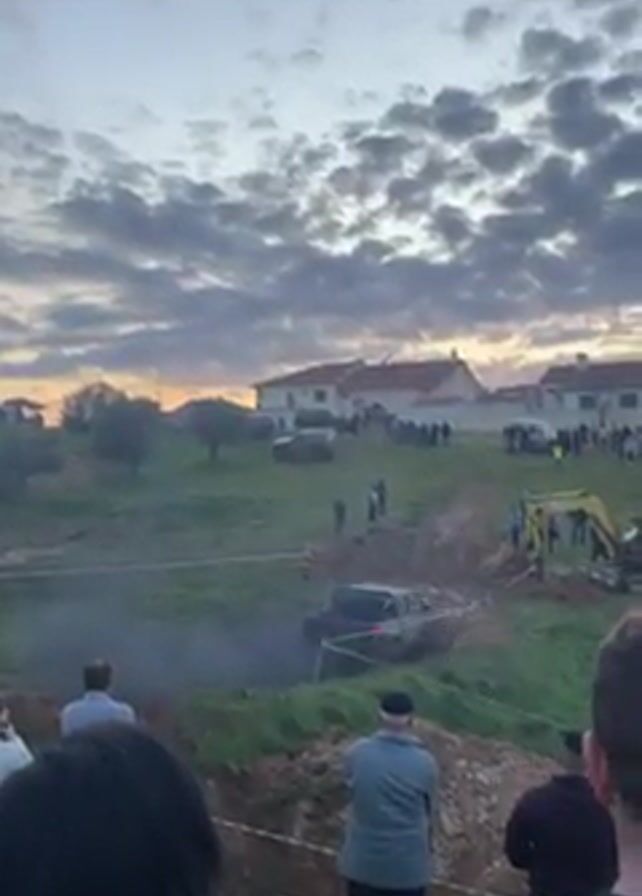 In an outdoor, medium shot, a black sedan is shown stuck in a muddy ditch. Steam rises from beneath the car as the tires struggle to gain traction, spinning and emitting a loud engine noise. A small yellow excavator sits on the right of the ditch, likely intended to assist in the vehicle's extraction. A crowd of people, mostly men, are gathered on the edges of the ditch, observing the scene. Houses and parked cars are visible in the background. The sky is overcast with a sunset glow on the horizon.
