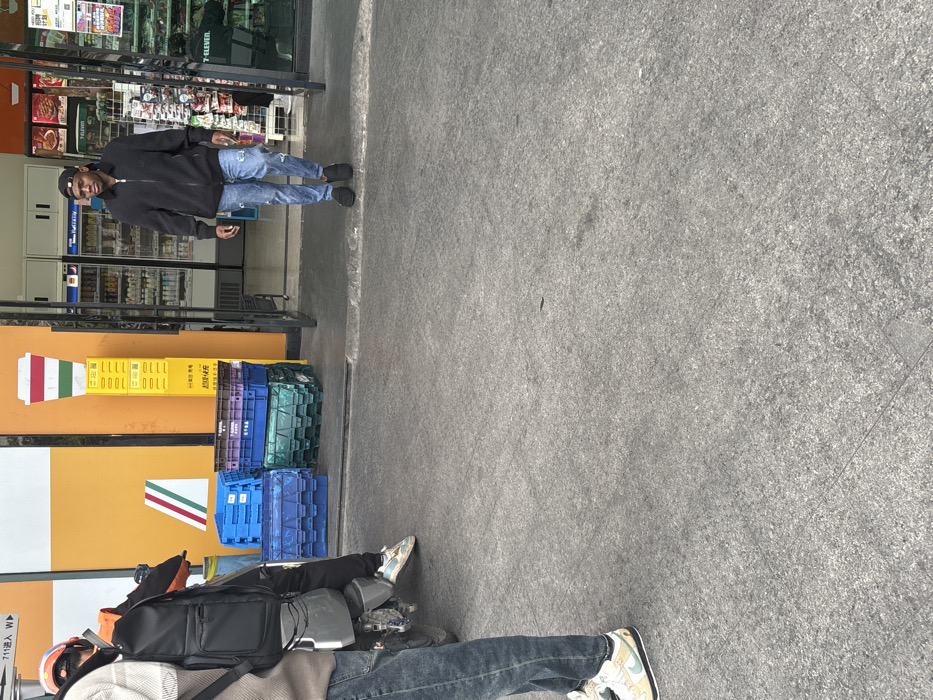 A man stands in front of a 7-Eleven store wearing a black hoodie and blue jeans. Stacks of yellow and blue crates sit beside him near the store’s entrance. Adjacent to the crates, a person is seated on a motorcycle with a black bag, wearing jeans and sneakers. The image is taken at an angle, showing the sidewalk and parts of the store facade.